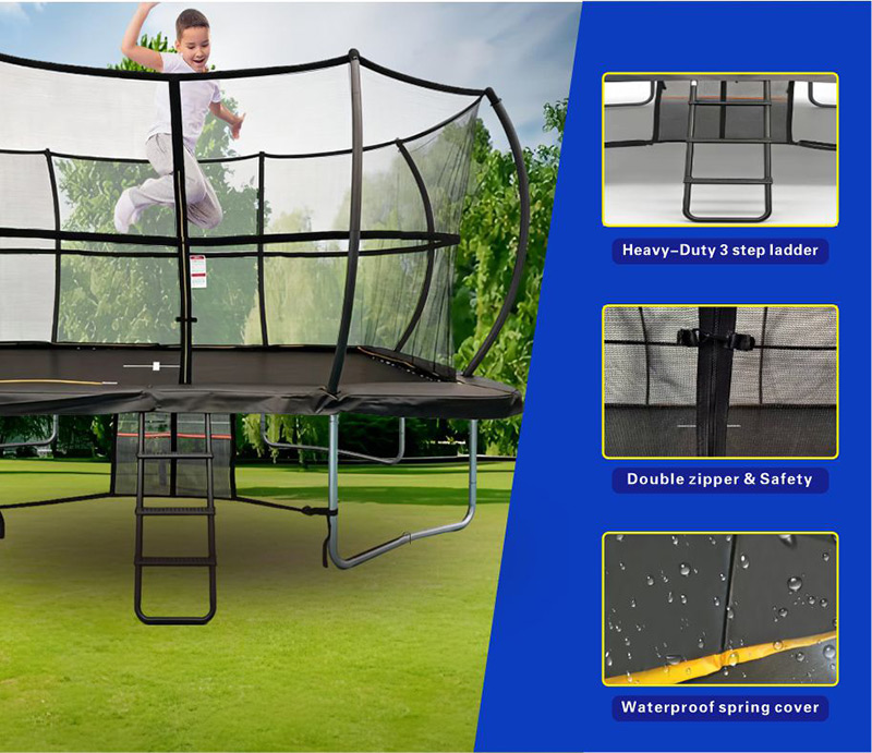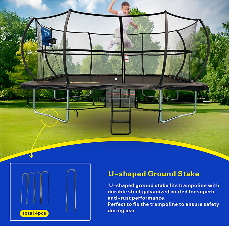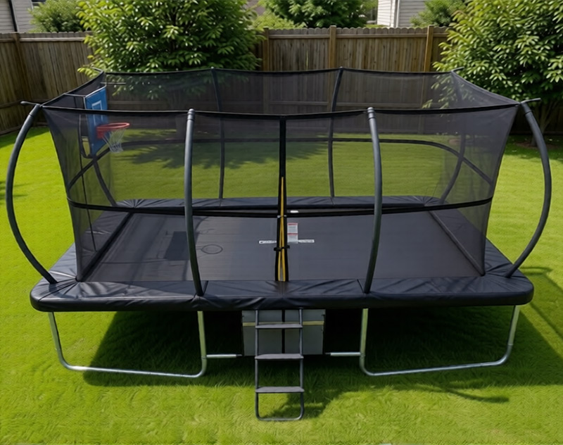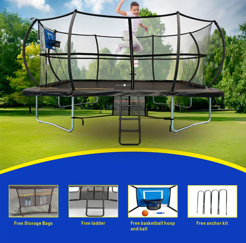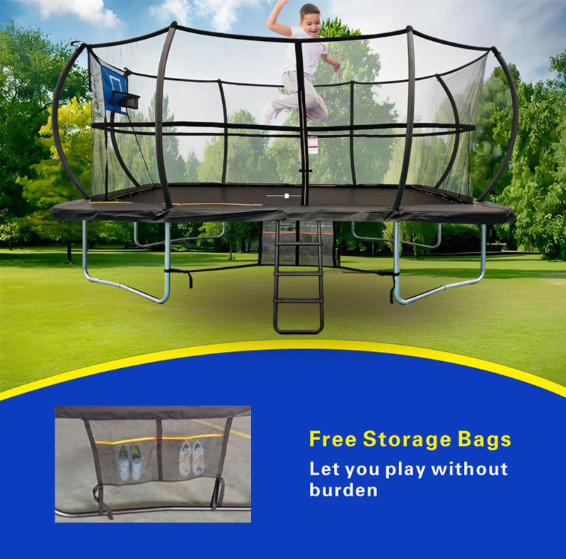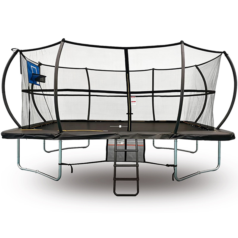 FREE GIFTSIncluded Free with every Big Air Super Bounce 8x12ft Rectangular Trampoline is a Powder Coated ladder with 3 non-slip plastic steps to help the kids get on and off the trampoline safely, a fantastic basketball game, an anchor kit and a Shoe Storage net with three compartments that will help remind everyone to take their shoes off when using the trampoline which will prolong the life span of the jump mat.