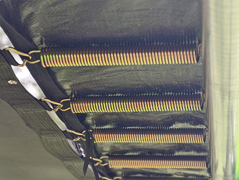 Springs;Spring quality and quantity should be set up depending on the most common user weight. Generally more or stronger springs are required for heavier users but this can affect bounce performance for lighter users. The Big Air trampoline comes with 76 Galvanised and Gold Zinc plated 178mm Max Bounce springs with increased helical circumference and greater resilience – leading to improved energy retention in the spring recoil. We have found this spring set up to produce the best all-round performance for the whole family resulting in an increased bounce for heavier users whilst still maintaining performance for lighter users.