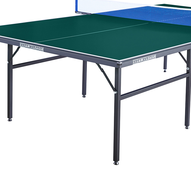 Th Air League Foldaway Indoor Table Tennis Table frame is 30mm strong metal. The quality tabletop is built around 12mm MDF. The top is finished with a multi layered anti-chip green, that gives a true bounce and has been designed to reduce the glare when playing in strong lighting.