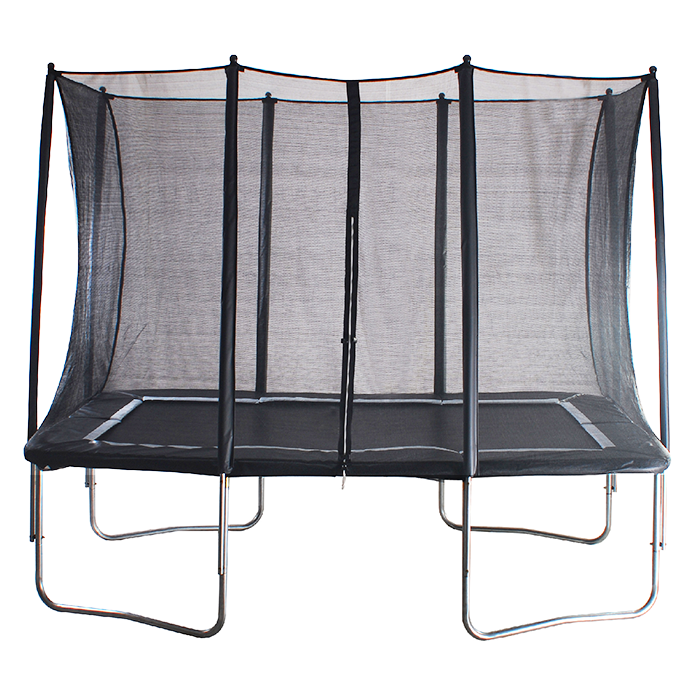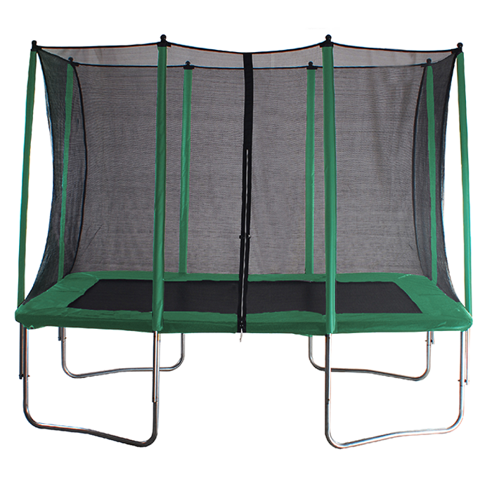 Safety Enclosure;The safety enclosure is the most effective safety feature you can get for a trampoline and the Big Air trampoline’s enclosure has been designed for optimal strength and durability but is still extremely easy to assemble. The mesh of the safety net is made from super strong and flexible Terylene threads. Featuring a large zipped entrance which offers a great compromise of easy entry and security. The enclosure poles are bolted to the frame which helps to keep the shape of the enclosure and have foam impact padding fitted to protect users and are also covered with a PVC sleeve to protect this important safety feature from the elements. The trampoline enclosure poles click together easily but due to the clever design remain in place even when faced with an out of control jumper to catch. The enclosure net is secured to the trampoline frame to keep users safely inside the trampoline.