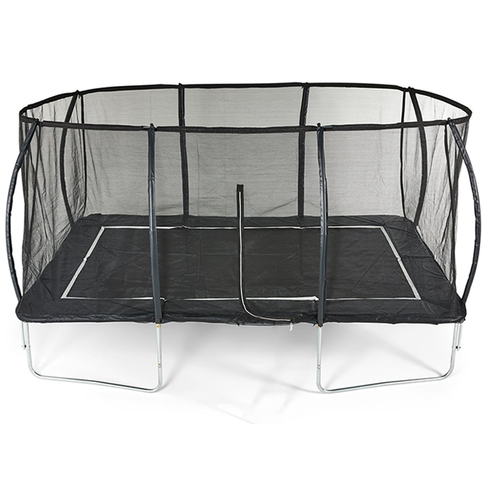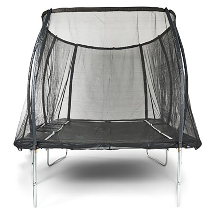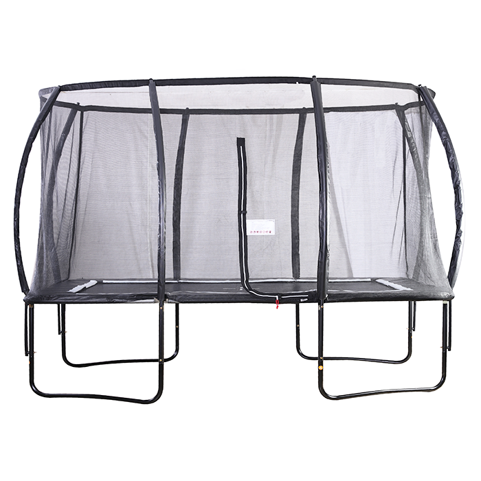 Safety Enclosure;The safety enclosure is the most effective safety feature you can get for a trampoline and the Big Air Extreme trampoline’s enclosure has been designed for optimal strength and durability but is still extremely easy to assemble. The mesh of the safety net is made from super strong and flexible Terylene thread and the intelligent design utilises cleverly curved poles to minimise the risk of accidents involving the upright posts. These also give the trampoline a very spacious open feel when you are on it. The enclosure net has a fiber rod making it durable and stable as it creates a secure frame around the top of the net this really is an extremely well thought out and safe enclosure. Featuring a large L shaped zipped entrance which we have found to offer the best compromise of easy entry and security. The enclosure poles have foam impact padding fitted to protect users and are covered with a PVC sleeve to protect this important safety feature from the elements. The trampoline enclosure poles click together easily but due to the clever design remain in place even when faced with an out of control jumper to catch. The enclosure net is secured to the trampoline frame to keep users safely inside the trampoline and also drastically reduces the chances of accidentally landing on the spring padding. The fiberglass poles that run around the top of the enclosure ensure there is no sagging of the top of the net and helps the net to run down they can also be easily removed should you need to take the net down for any reason.
