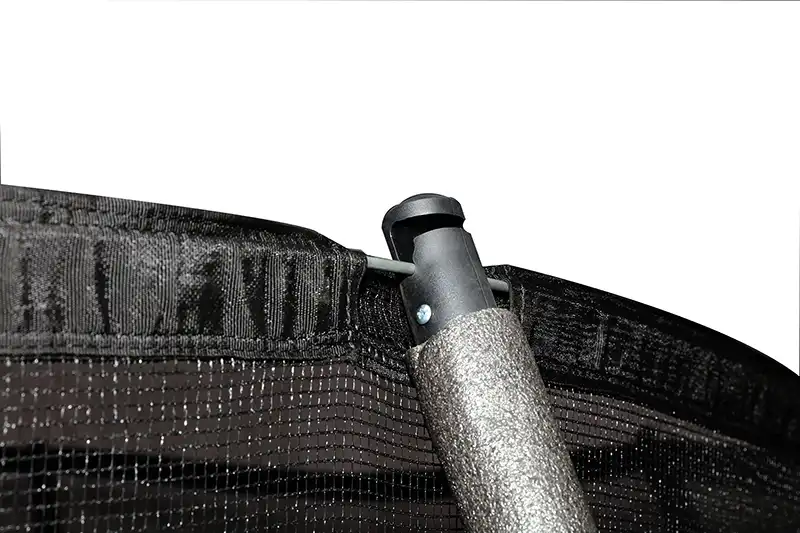 Safety Enclosure The safety enclosure is the most effective safety feature you can get for a trampoline and the Big Air Universal 14ft trampoline’s enclosure has been designed for optimal strength and durability but is still extremely easy to assemble. The mesh of the safety net is made from super strong and flexible Terylene thread and the intelligent design utilises cleverly angled poles to minimise the risk of accidents involving the upright posts. Combining this with the vertically running net and this really is an extremely well thought out and safe enclosure. Featuring a large I shaped entrance which we have found to offer the best compromise of easy entry and security. The enclosure poles have foam impact padding fitted to protect users and are covered with a pvc sleeve to protect this important safety feature from the elements. The trampoline enclosure poles click together easily but due to the clever design remain in place even when faced with an out of control jumper to catch. The enclosure net is securely tied to the jump mat to keep users safely inside the trampoline and also drastically reduces the chances of accidentally landing on the spring padding. The poles that run around the top of the enclosure ensure there is no sagging of the top of the net and help the net to run vertically down to the edge of the jump mat.